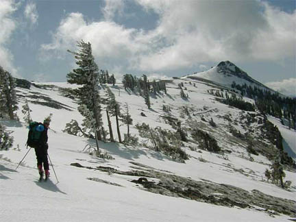 From the Benson Hut, one can either climb up and over the top of Anderson Peak or angle around the west side above treeline to the southern flank, where the ridgeline continues to the southeast for 1.5 miles to Tinker Knob (8,949'). This ridgeline has spectacular views both to the east of the mountains surrounding Lake Tahoe and to the west of the Sierras and, on a clear day, the central valley. The route curls around the east flank of Tinker Knob and then begins a gradual traversing descent for about 2.5 miles to Mountain Meadow Lake (7,900'). A quarter mile beyond the lake, take the gully which steepens before running into Squaw Creek and the ski lifts of Squaw Valley. From here, it is possible to ski out through Squaw Creek or take a lift and ski down the main runs at Squaw Valley.